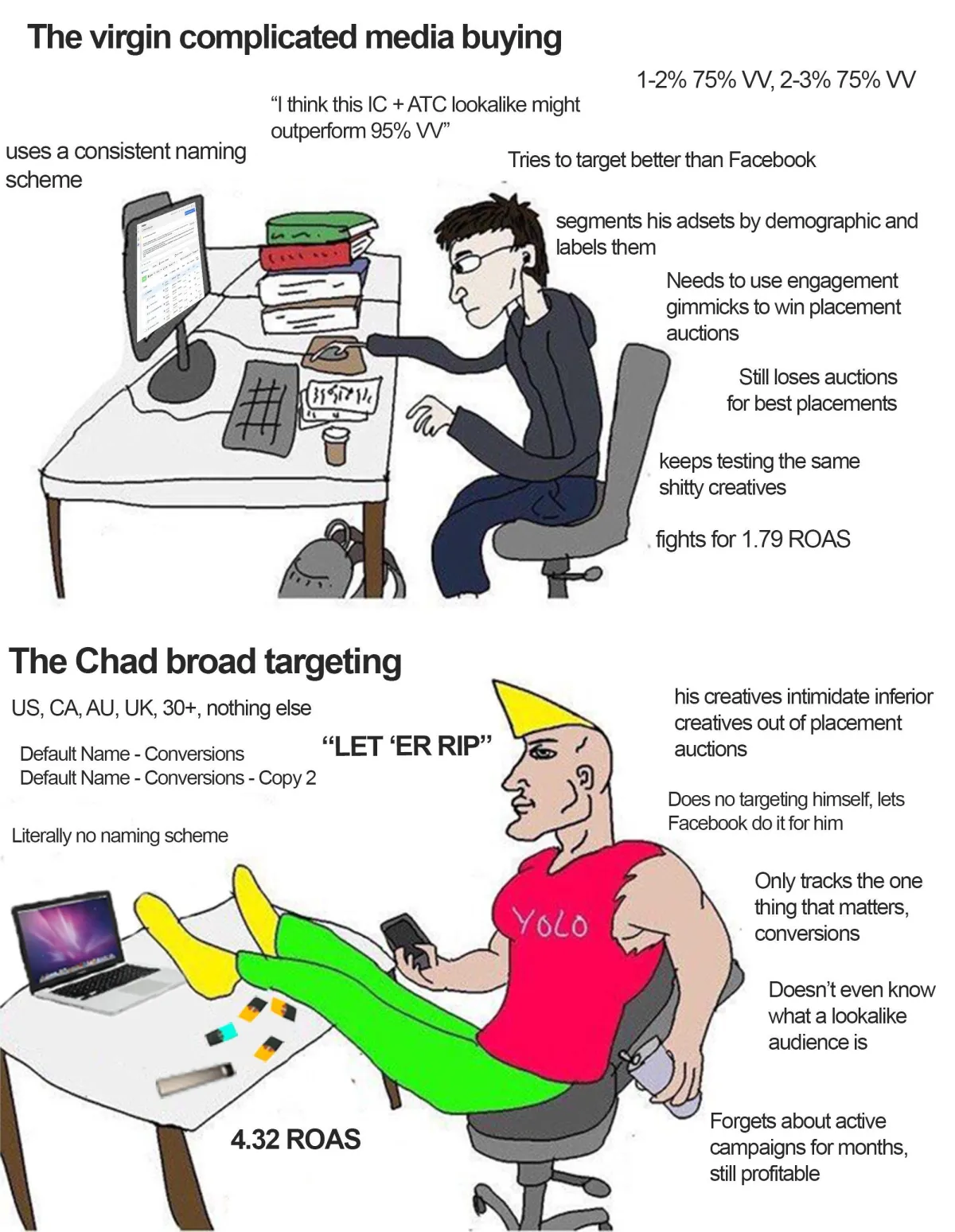 Camp #1: virgin ad buyers who obsess over audience testing and searching for the next algorithm loophole - just to acquire customers at 0.68 ROAS or at break even (best case scenario...).